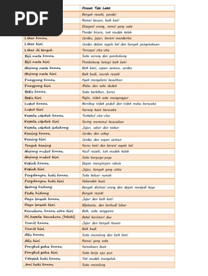 Itu dia tadi, maksud tahi lalat di muka. Arti tahi lalat di jari. Tahi lalat di daerah kemaluan = nafsu besar tahi lalat di lutut depan = kuat berjalan tahi lalat di lutut sebelah dalam (lipatan/belakang lutut) = hatinya tidak tetap tahi lalat di betis = dapat di percaya tahi lalat di tulang kaki kanan (tulang kering). Menurut primbon jawa tahi lalat yang letaknya tepat dibawah saluran hidung disebut dengan nama palguna. Rahsia dan maksud tahi lalat yang kelakar dan tak masuk akal.